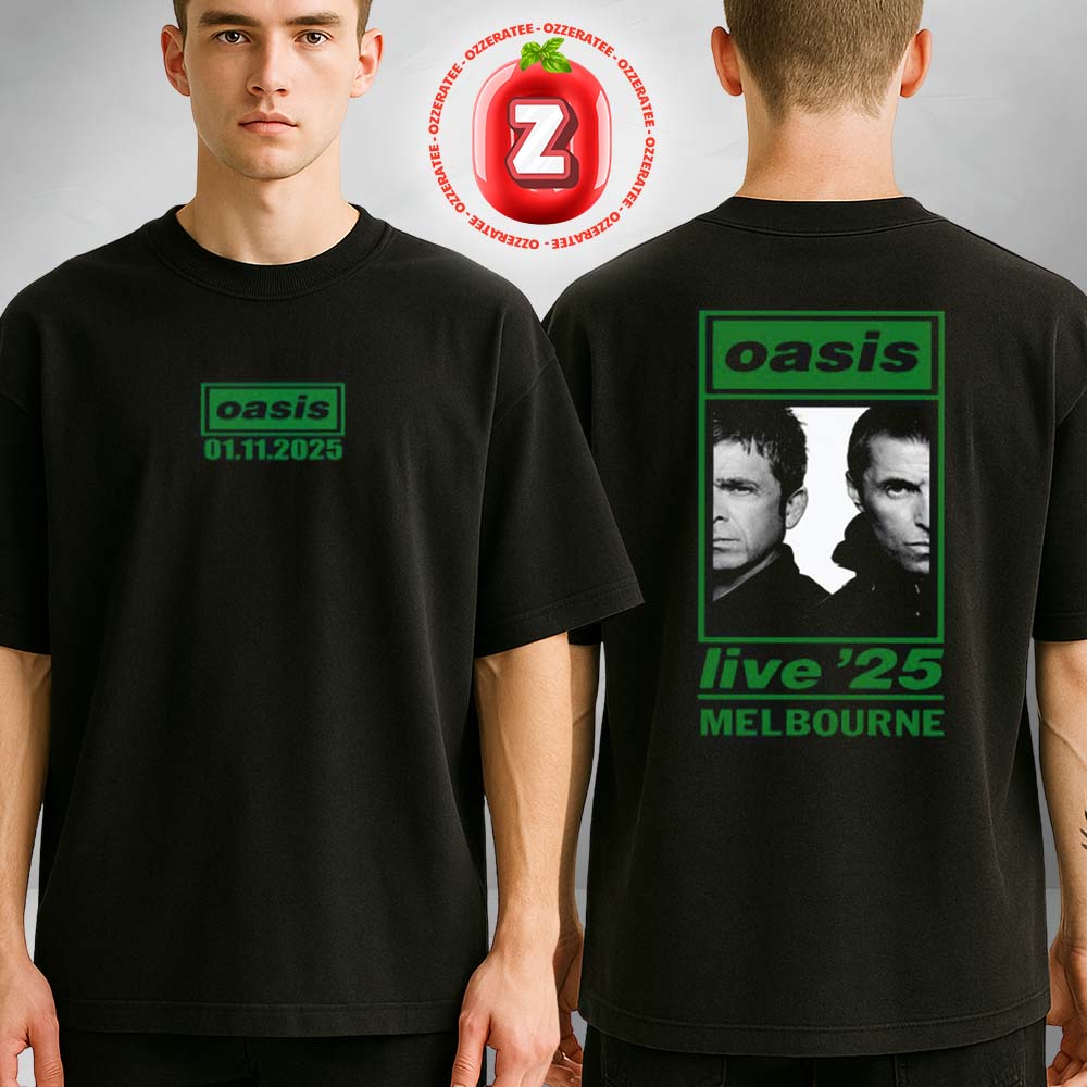 Oasis Shirt At Melbourne Arena In Melbourne Australia On November 1 2025 Live 25 Reunion Green Frame Two Sides Unisex T-Shirt Features: